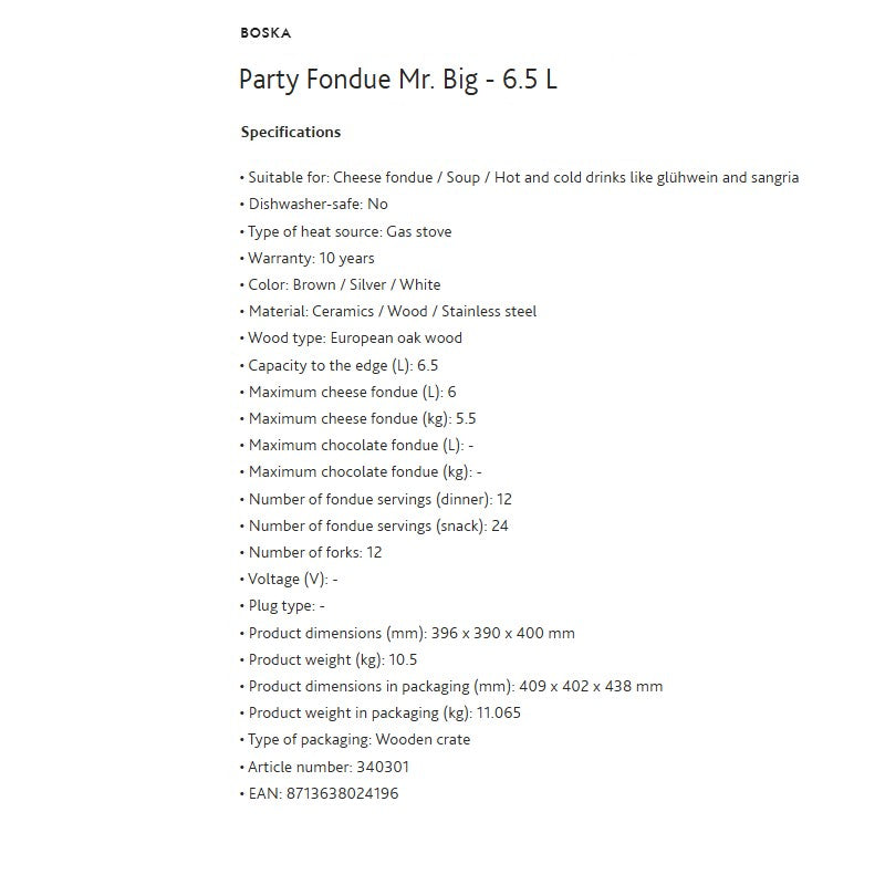 The set includes an impressive 6.5-litre ceramic fondue pot in which you can melt up to 5.5 kg of cheese fondue  enough for a meal for 12 people or a snack for 24. The pot, which is suitable for gas stoves, is also perfect for serving 6 litres of chilled sangria or keeping 6 litres of hot chocolate or mulled wine warm. The set also includes an oak wood base, 12 fondue forks with oak wood handles and 3 burners for use with methylated spirit or burning gel (not included). Not dishwasher-safe.